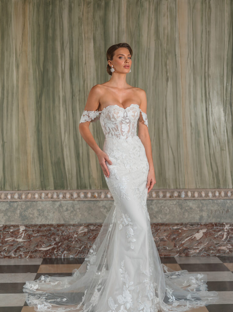This A-line gown is the epitome of modern elegance. Showcasing a contemporary V-neckline, it’s adorned with bold, shimmering botanical appliqués intricately embroidered on soft tulle. The striking low back is both structured and alluring, framed by delicate, slender straps that add a touch of sophistication. Flowing effortlessly, the glitter tulle skirt creates a dreamy, ethereal silhouette—unforgettable in its beauty and undeniably romantic.